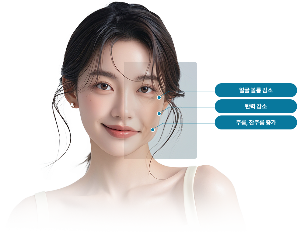 탄력 감소, 주름, 피부 색변화, 볼륨 감소 등이 발생됩니다.