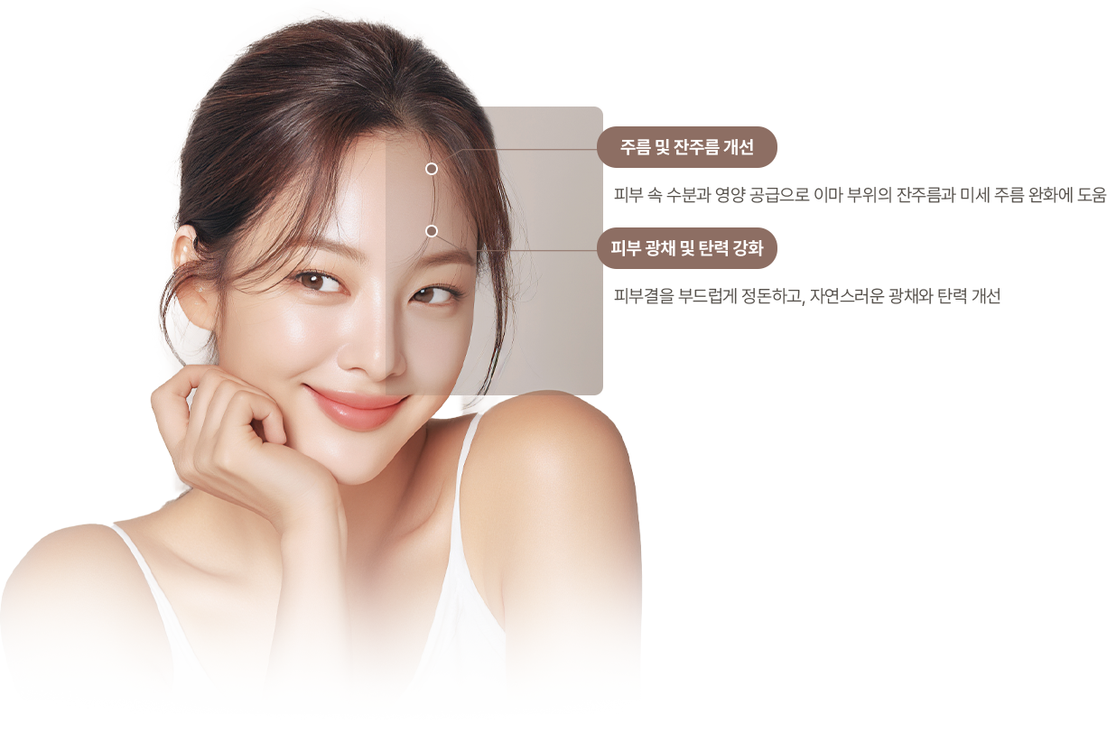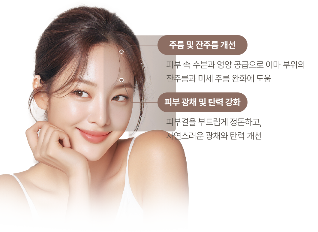 자연스러운 표정은 유지하면서 이마 피부의 주름과 결을 관리하는 스킨부스터입니다.