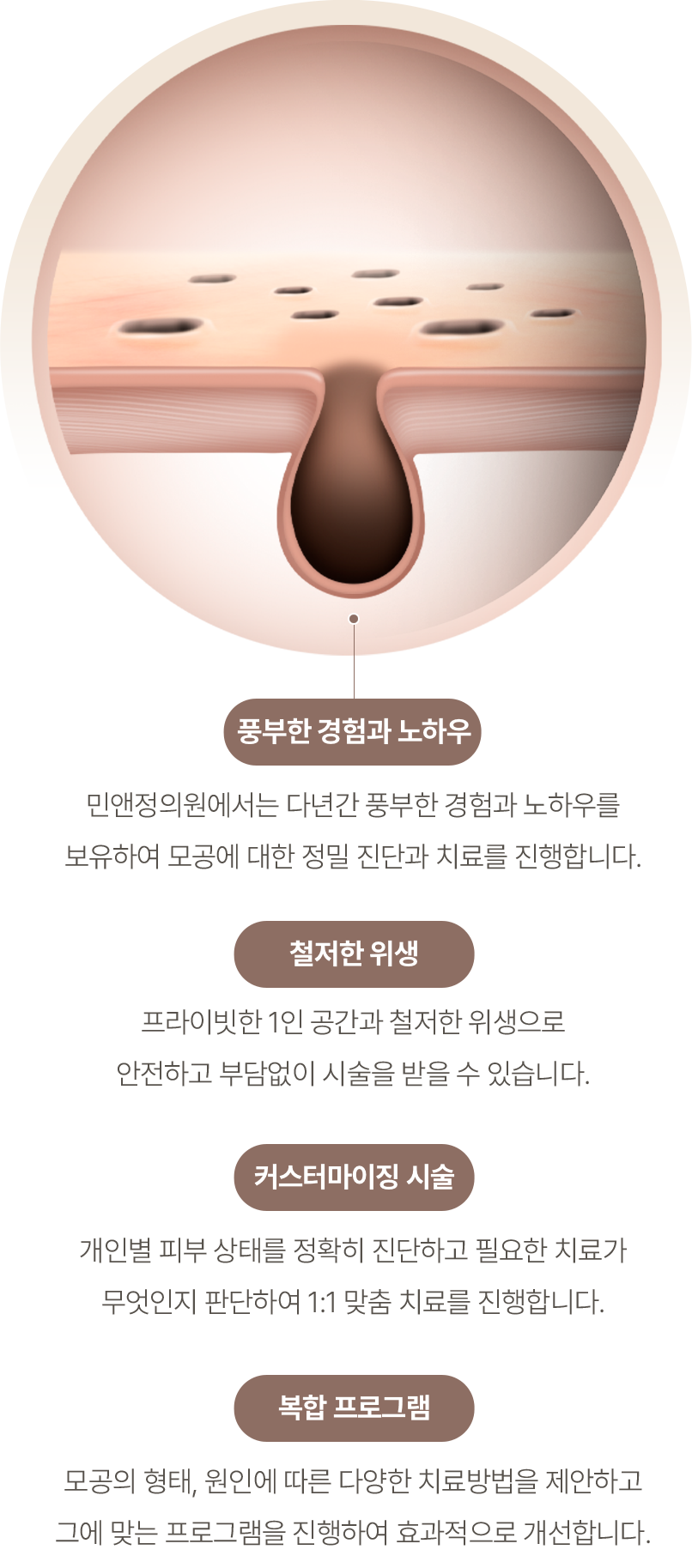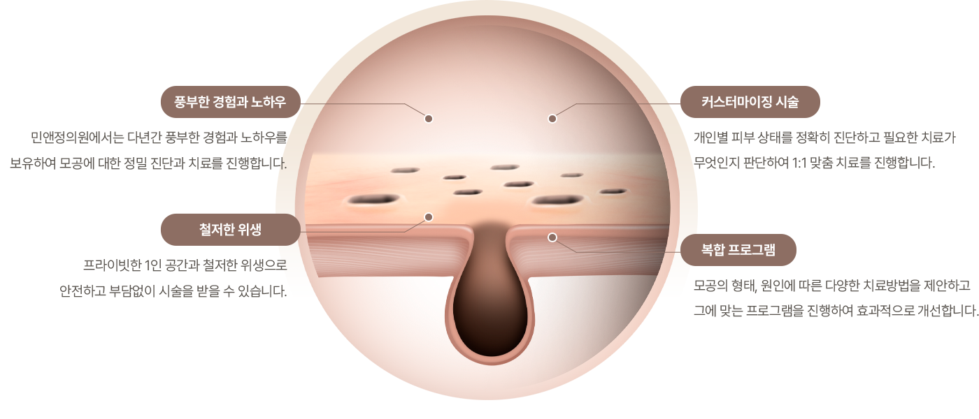 민앤정의원에서는 모공과 흉터 재생에 효과적인 복합적 시술을 통해, 피부 본연의 건강한 재생력을 끌어올리고